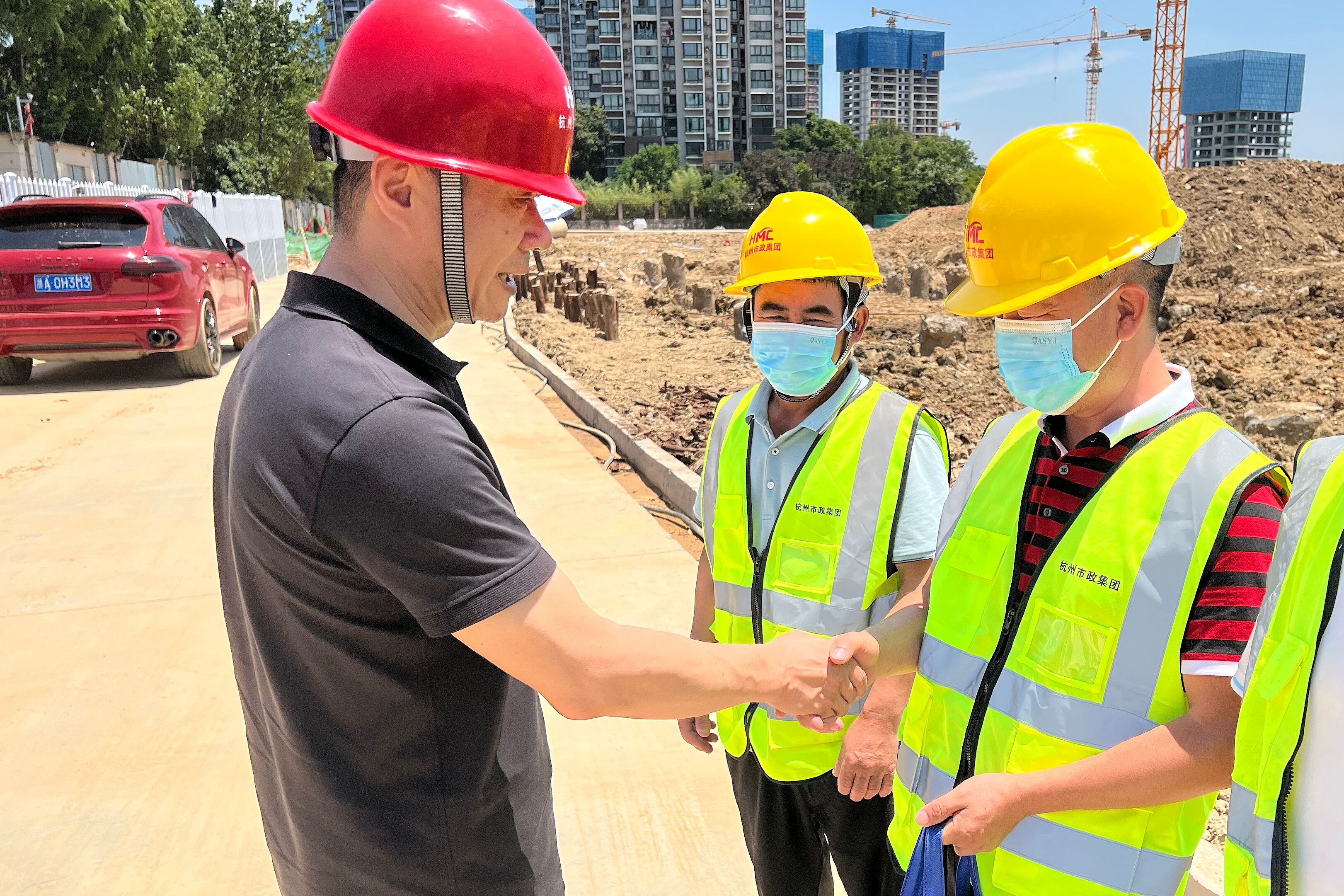 13日、14日,集团公司党委书记、工会主席王欢和党委委员、纪委书记、工会副主席、党群工作部主任程澄,副总经理方赤华一起,带领总部有关部门人员,顶着烈日先后赶赴养护分公司嘉善项目、杭州未来科技城第八小学项目现场看望慰问一线人员。